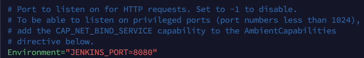 vi /usr/lib/systemd/system/jenkins.service 으로 해당 파일을 열고 아래 부분의 포트를 변경하자.