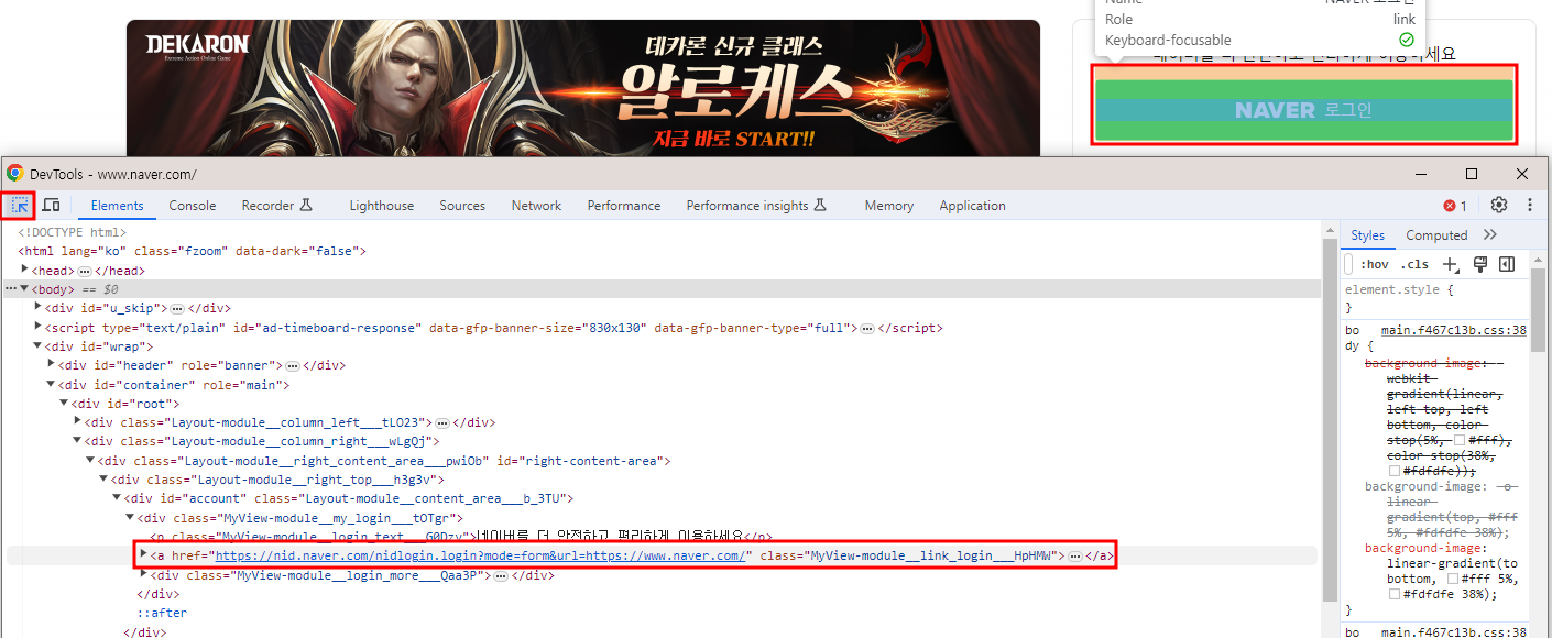 - 크롬 -> F12(개발자도구) -> 타이틀 아래 화살표 클릭 후 NAVER 로그인 초록색 네모 클릭