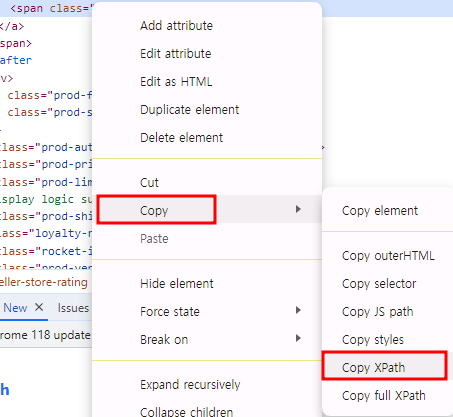 - F12 -> 원하는 값 위치 우클릭 -> Copy -> Copy XPath
