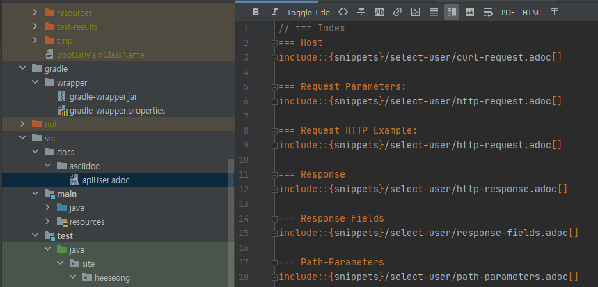 gradle 경우 src/docs/asciidoc 경로에 만들어 주어야 기능이 정상적으로 동작합니다.